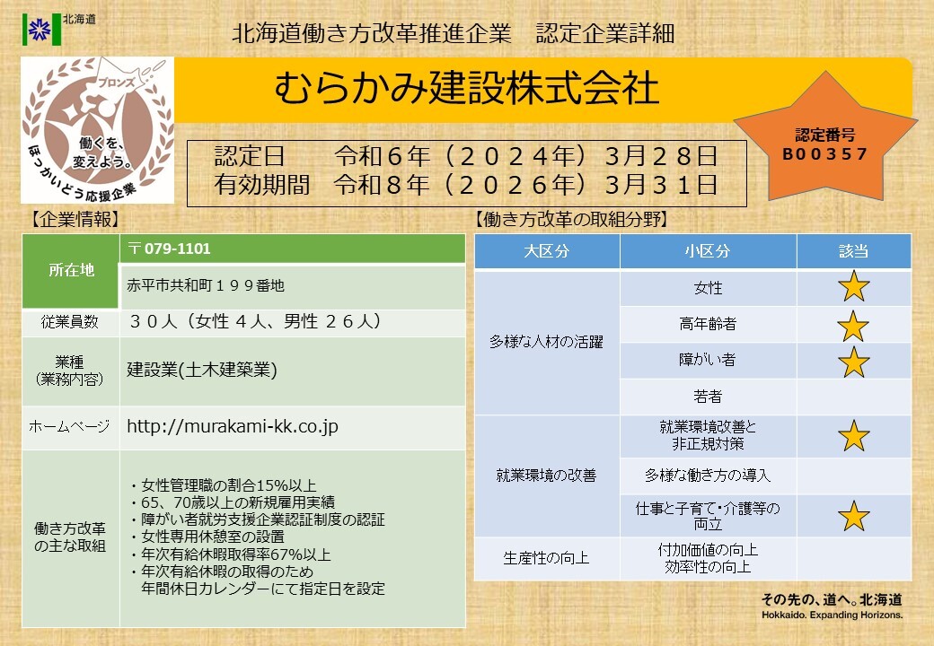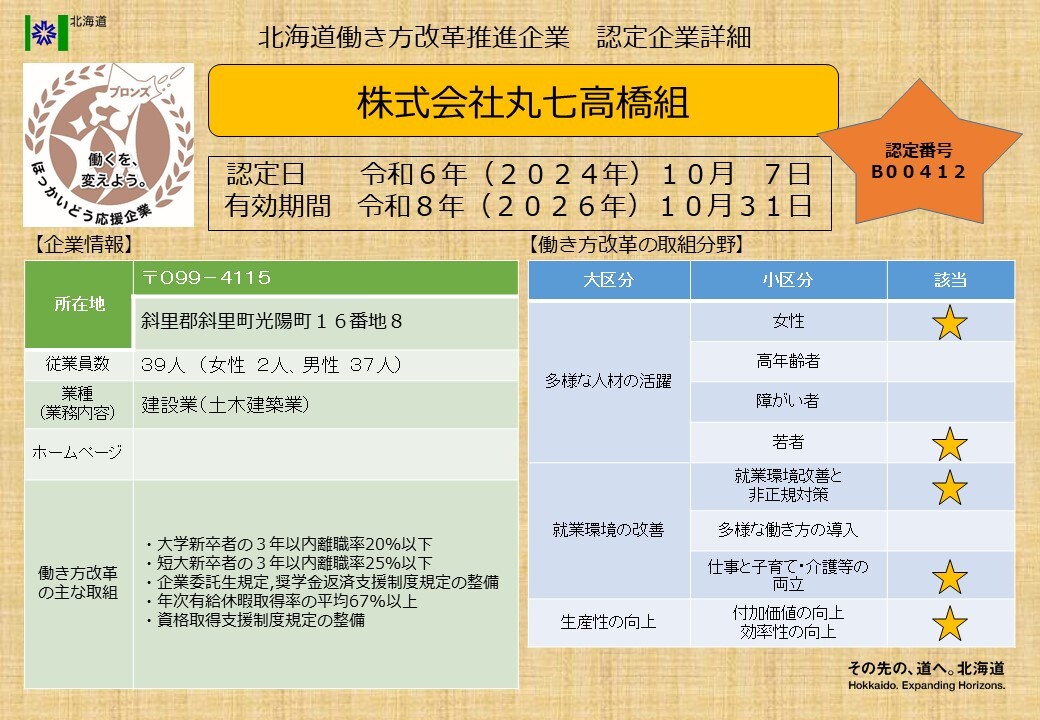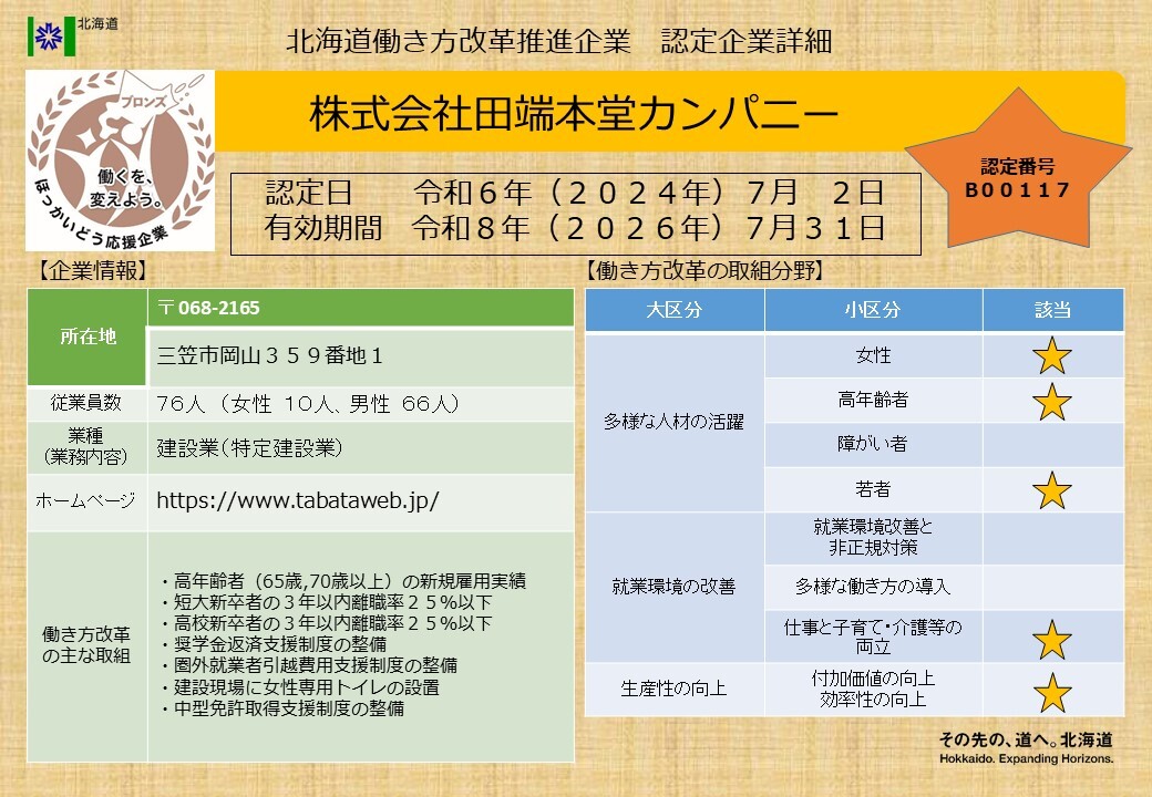 北海道働き方改革推進企業ブロンズ認定企業一覧