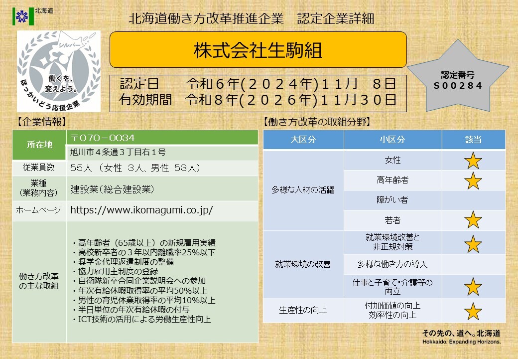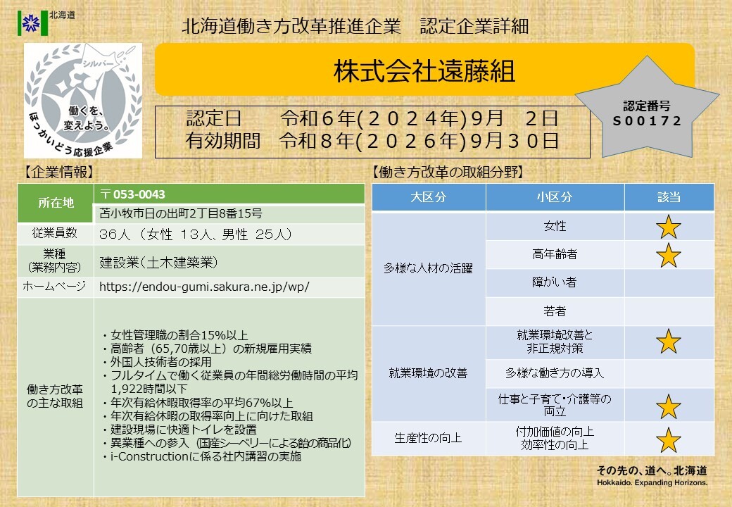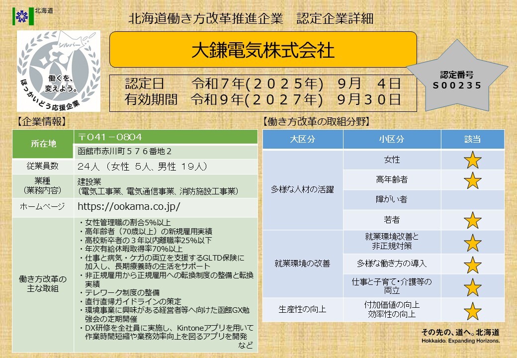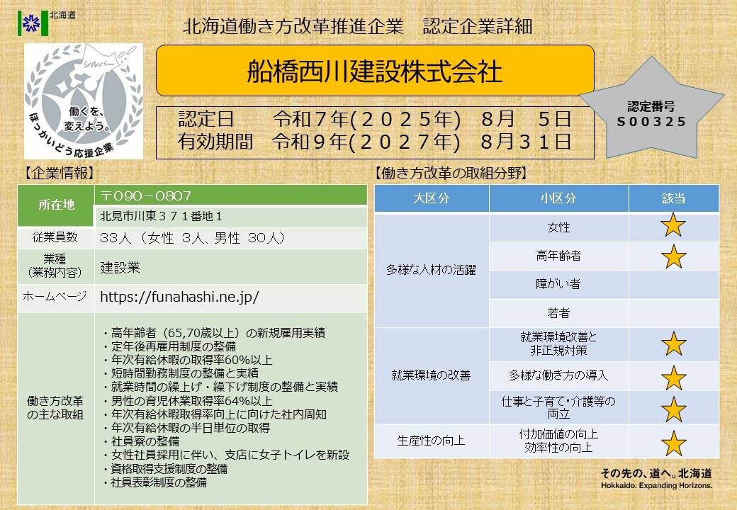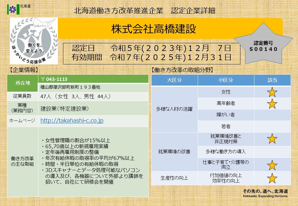 北海道働き方改革推進企業シルバー認定企業一覧