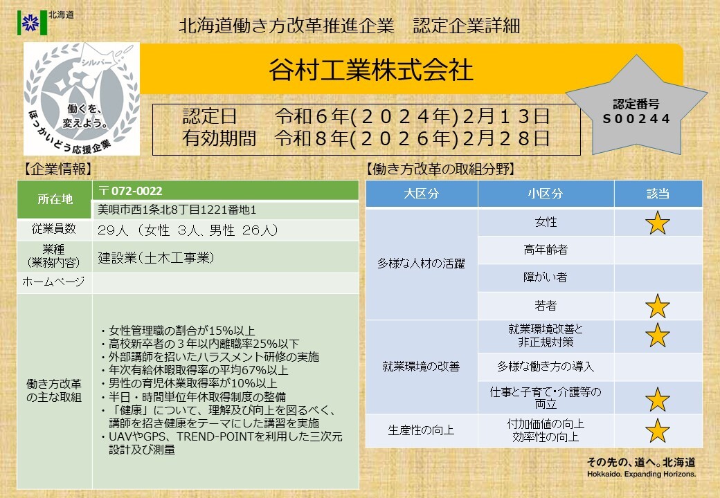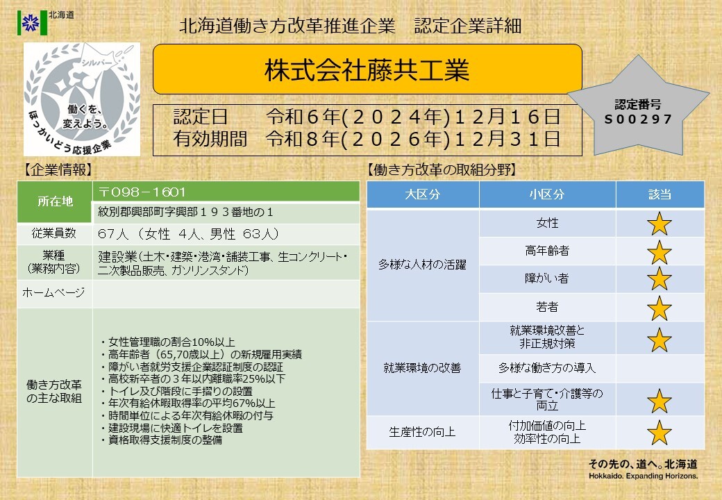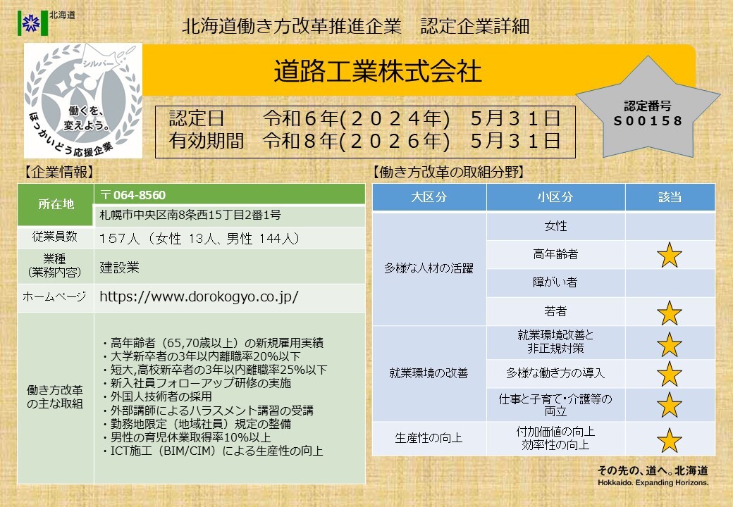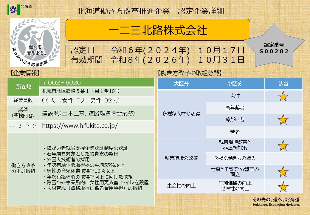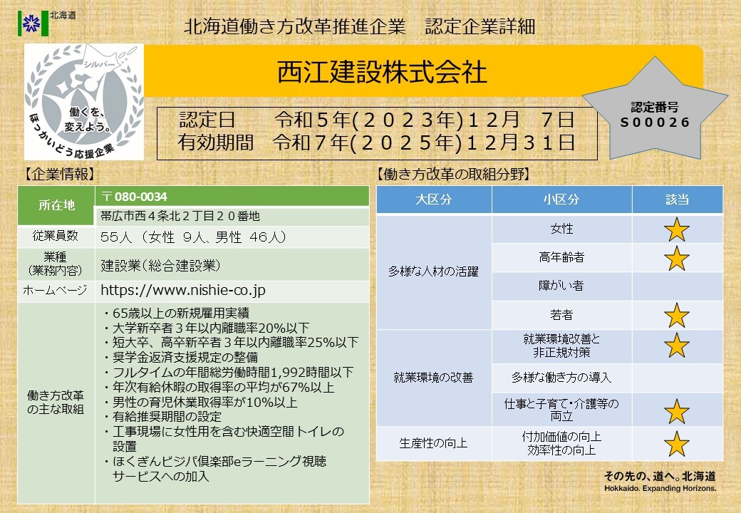北海道働き方改革推進企業シルバー認定企業一覧