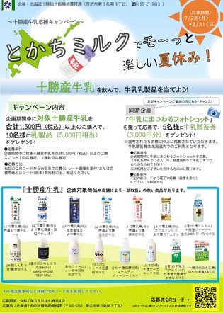 管内の牛乳の消費拡大を図ることを目的に、十勝産牛乳消費拡大企画「とかちミルクでモ~っと楽しい夏休み!~十勝産牛乳応援キャンペーン~」を実施。