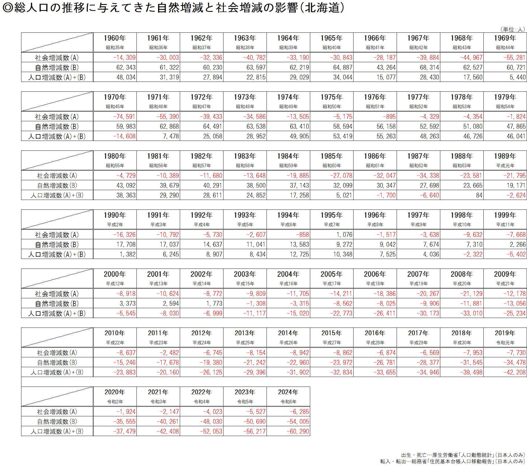 総人口の推移に与えてきた自然増減と社会増減の影響(北海道)