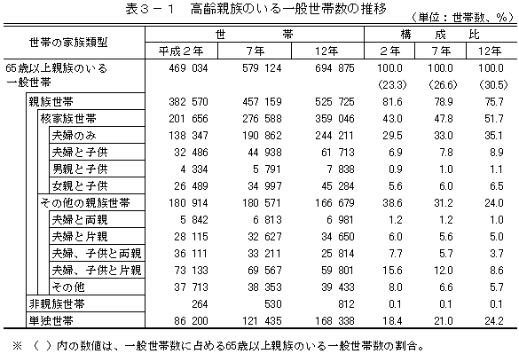 65歳以上の親族(高齢親族)のいる一般世帯は694,875世帯で、一般世帯全体に占める割合が、平成7年に26.6%であったものが、12年には30.5%と3.9ポイント増加しており、高齢化の進行を示している。